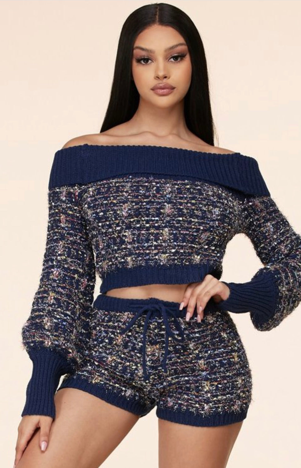 Description: Navy blue sweater knit shorts set features a crop top with ribbed fold-over detail, bishop sleeves, metallic details, and is paired with matching drawstring hot shorts.