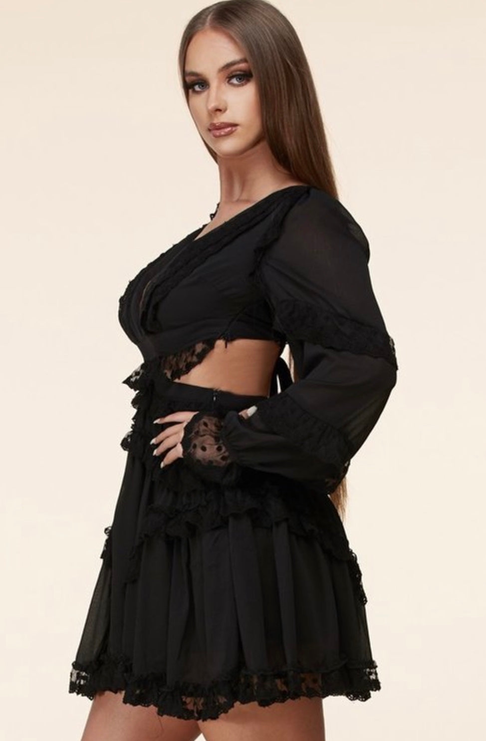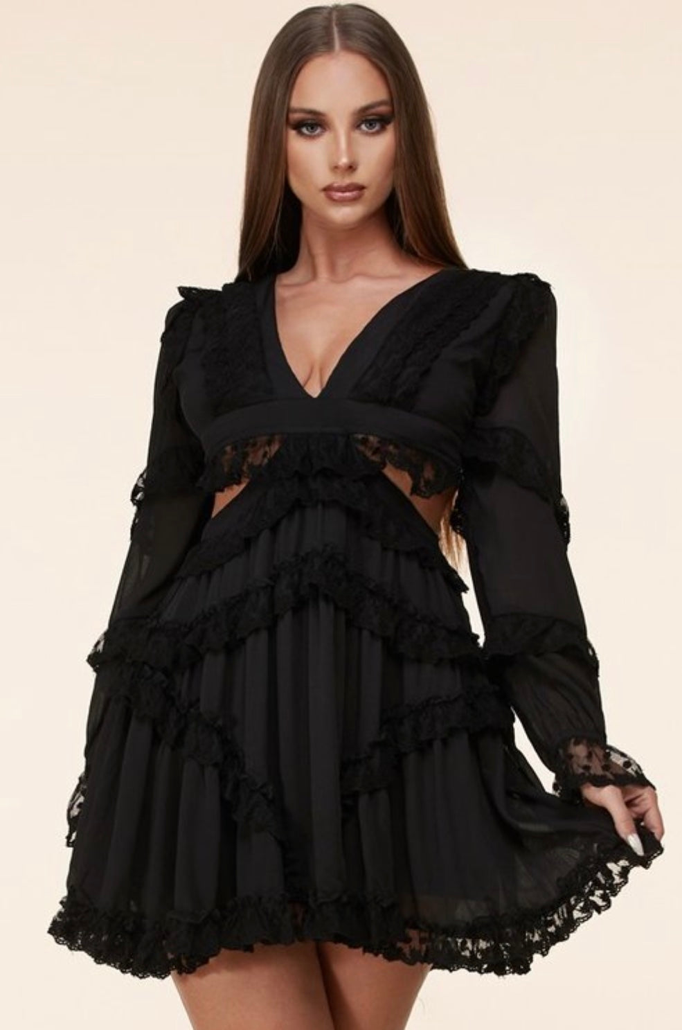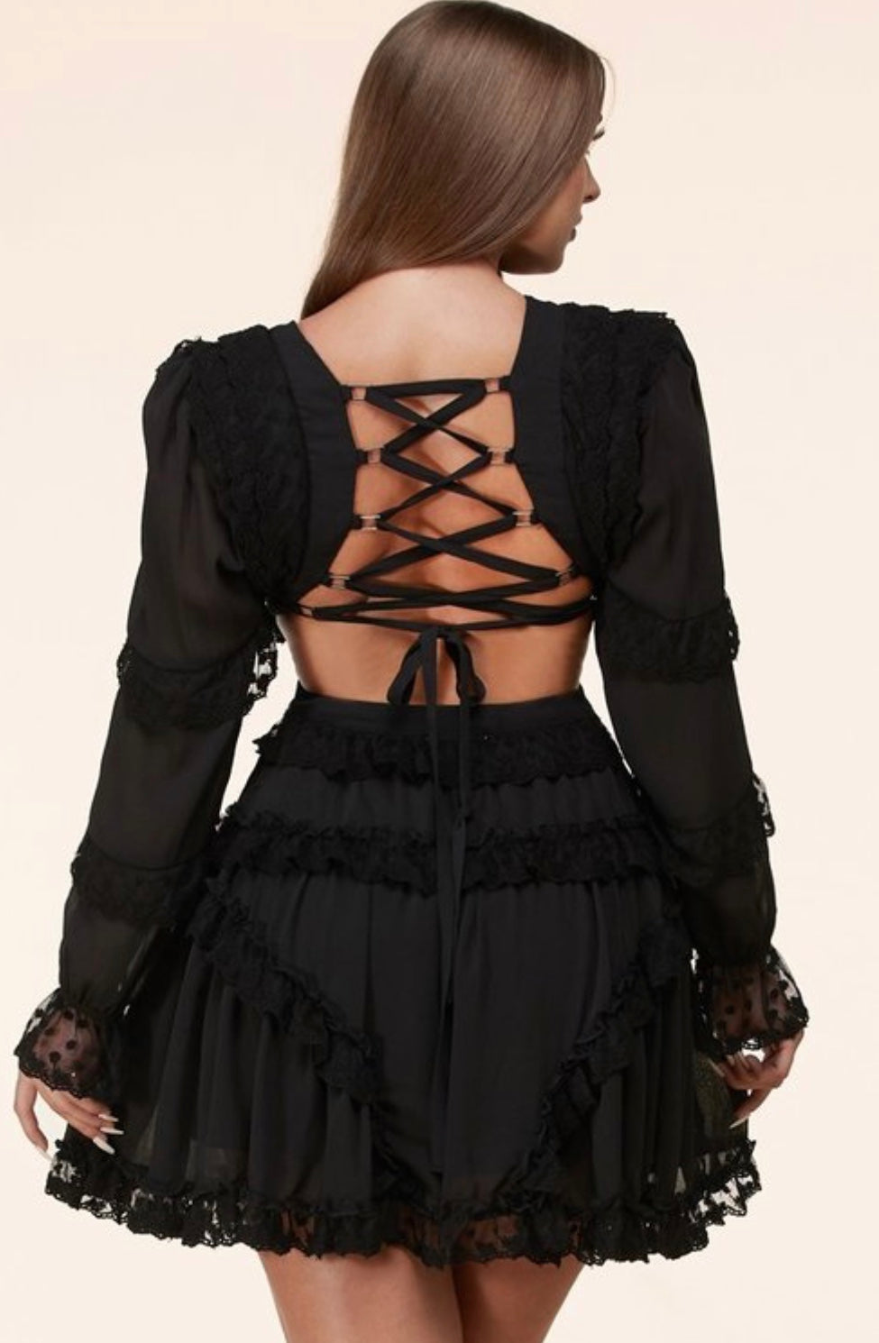 Description:This ultra-feminine mini dress features contrast floral lace ruffle accents throughout, long bell sleeves, and a flirty lace-up back with silver-tone grommets.