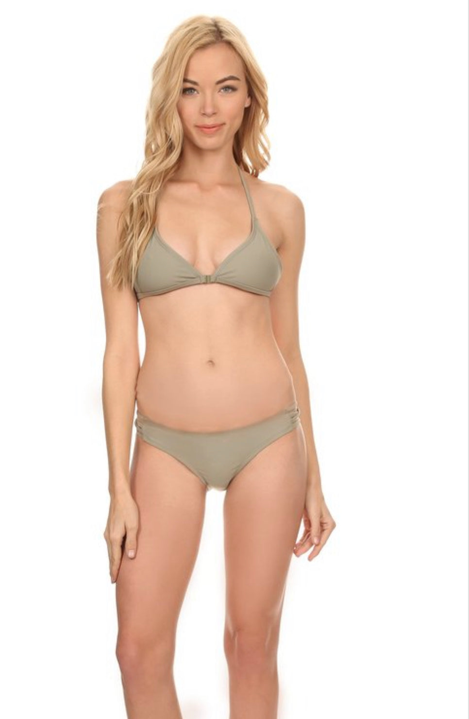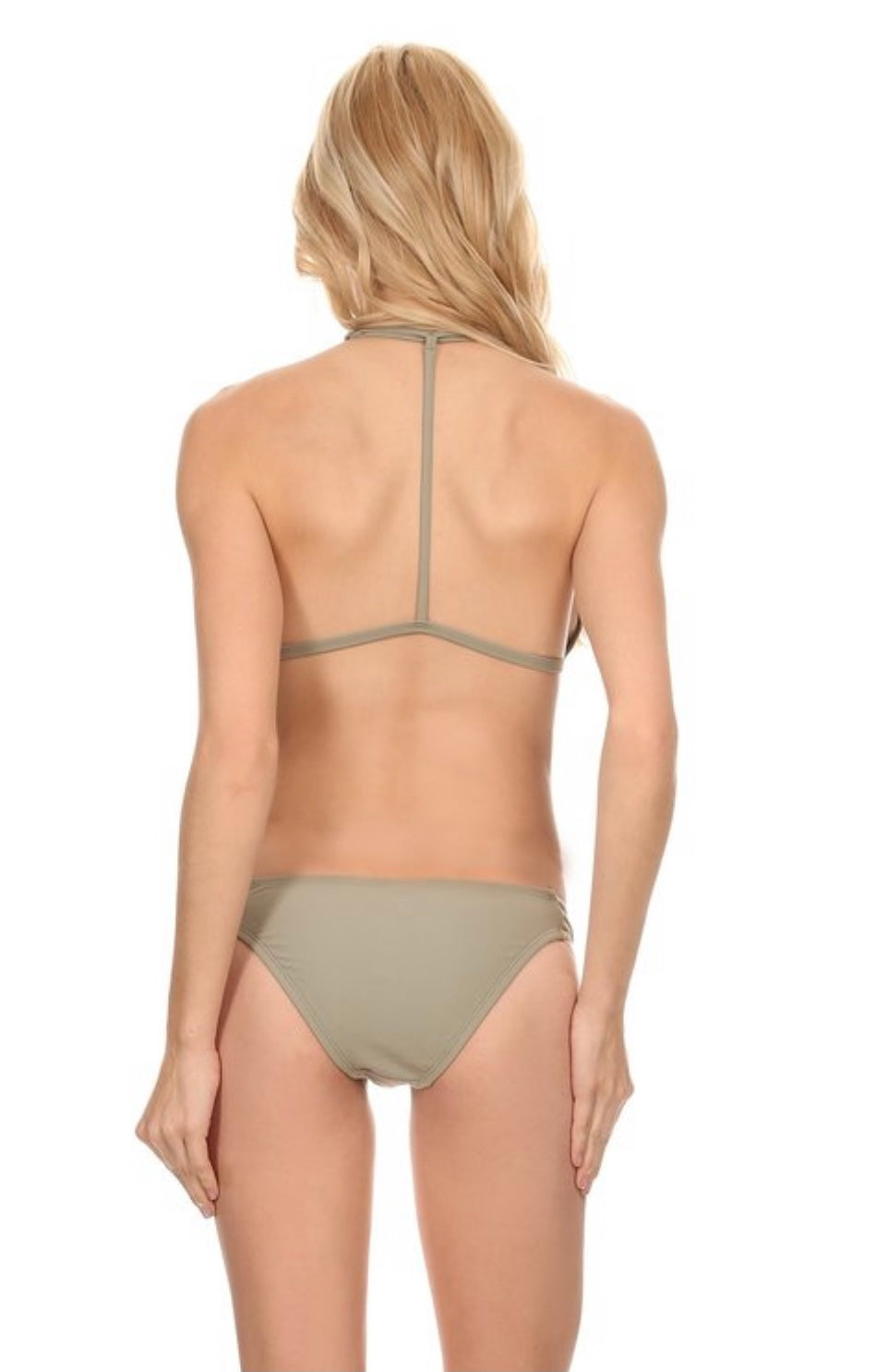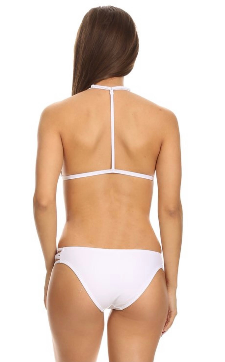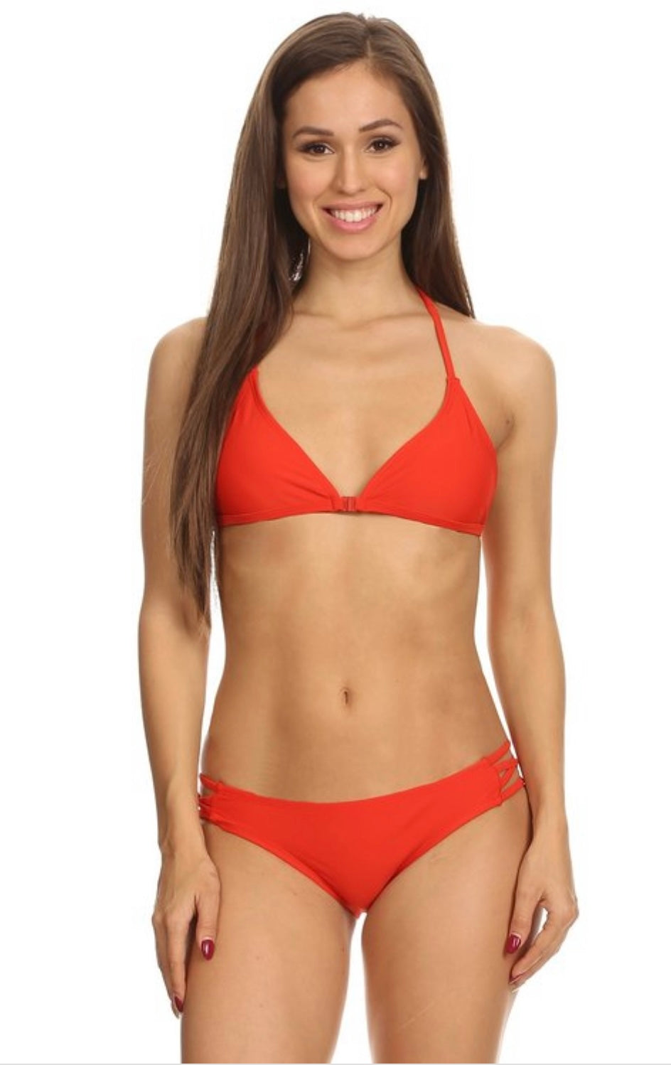 Description: Cute White, Red, Teal, Olive, and Taupe color 2 piece swimsuit with an open back with a one strap detail to give the back some style, triangle none padded cups, adjustable halter strap for a more comfortable fit.