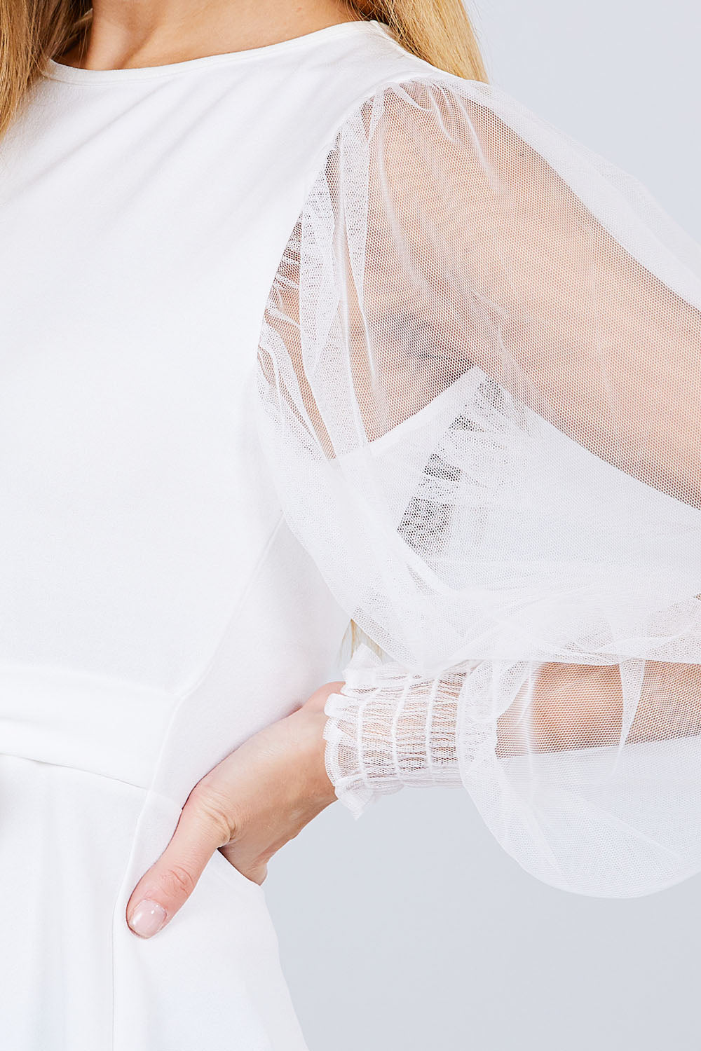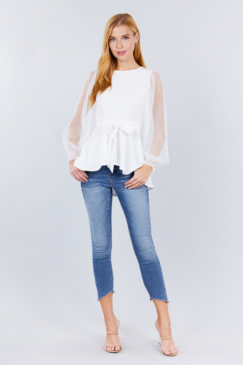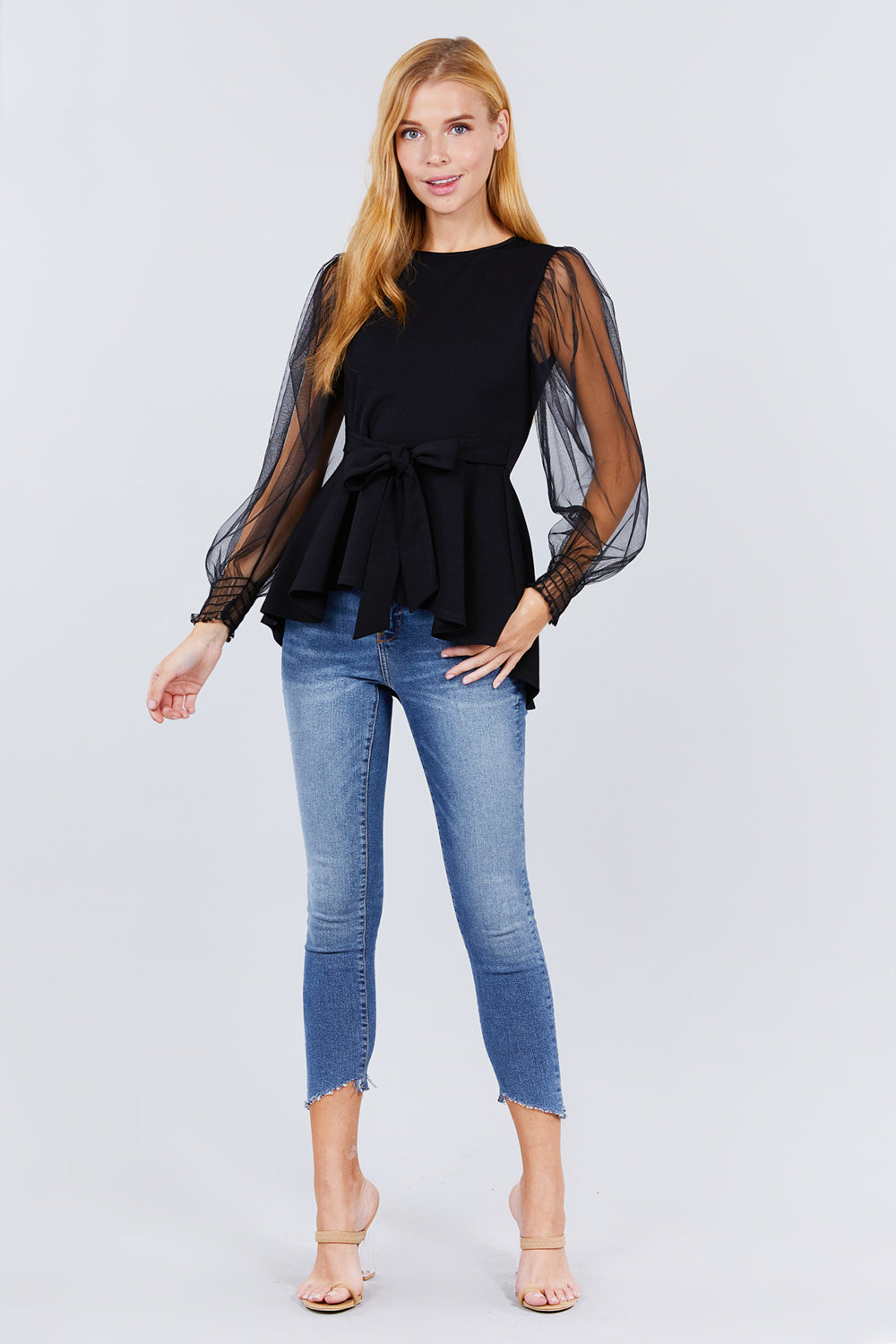LONG MESH PUFF SLEEVE ROUND NECK W/SELF TIE PEPLUM KNIT TOP