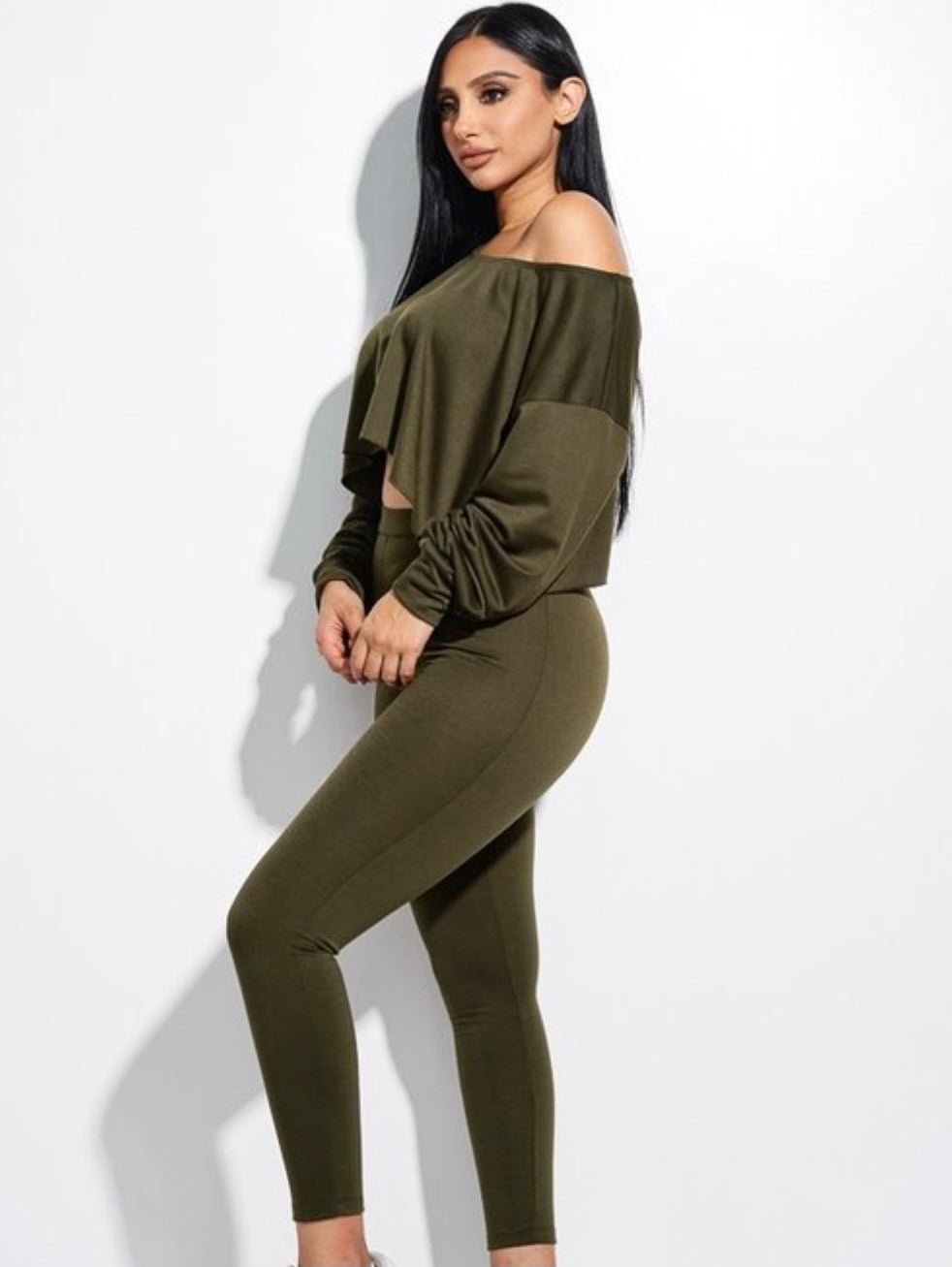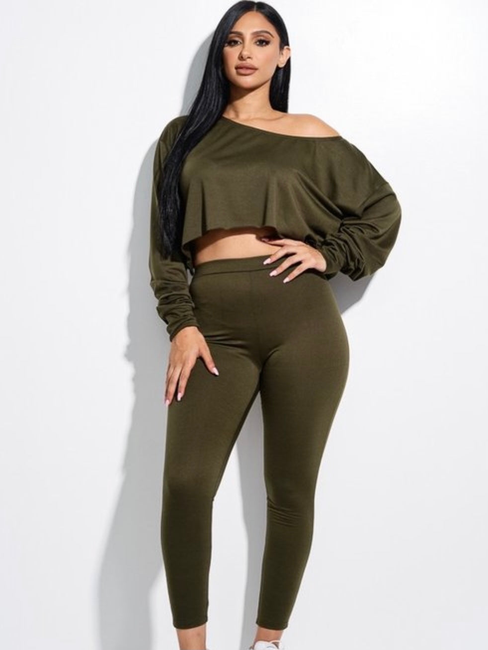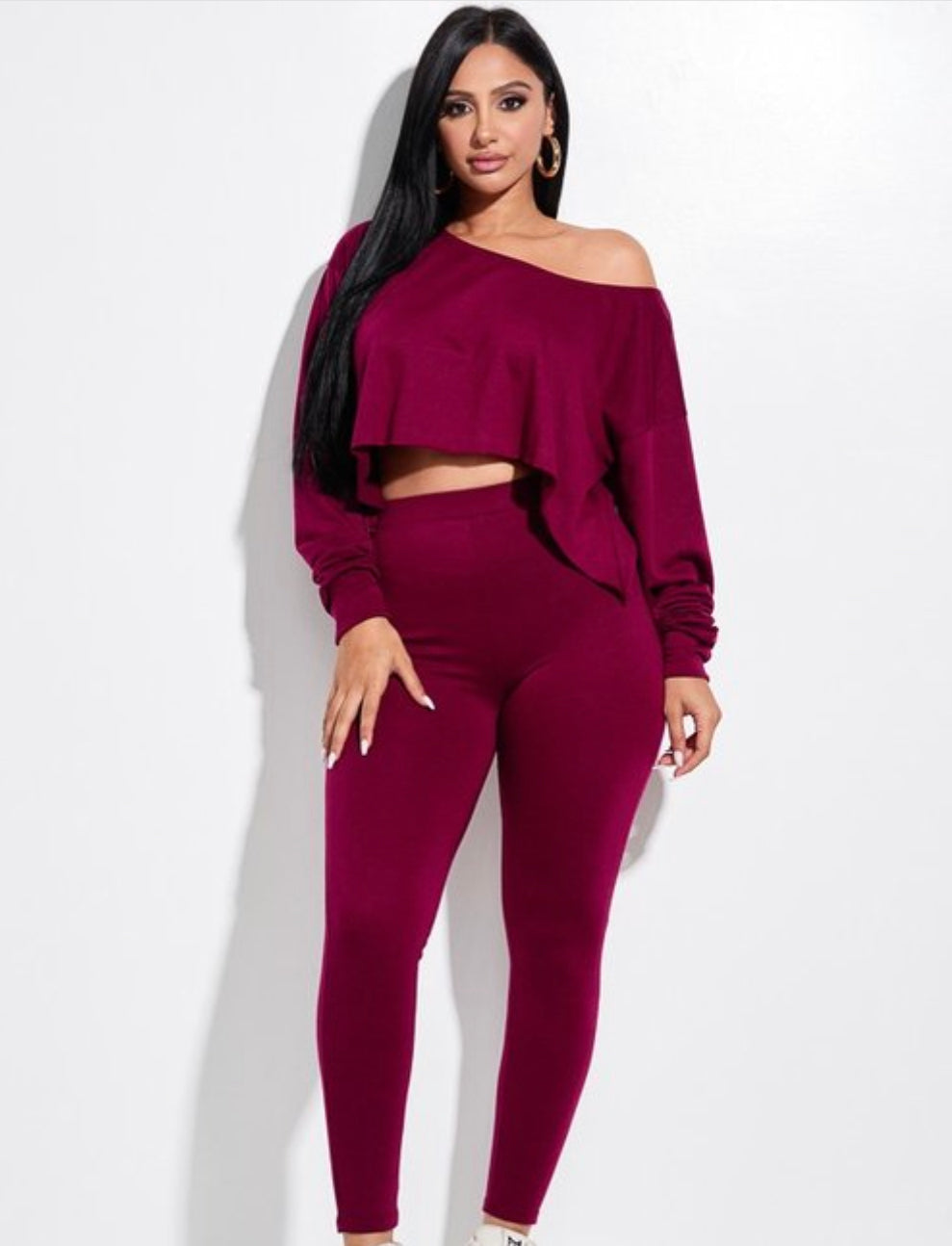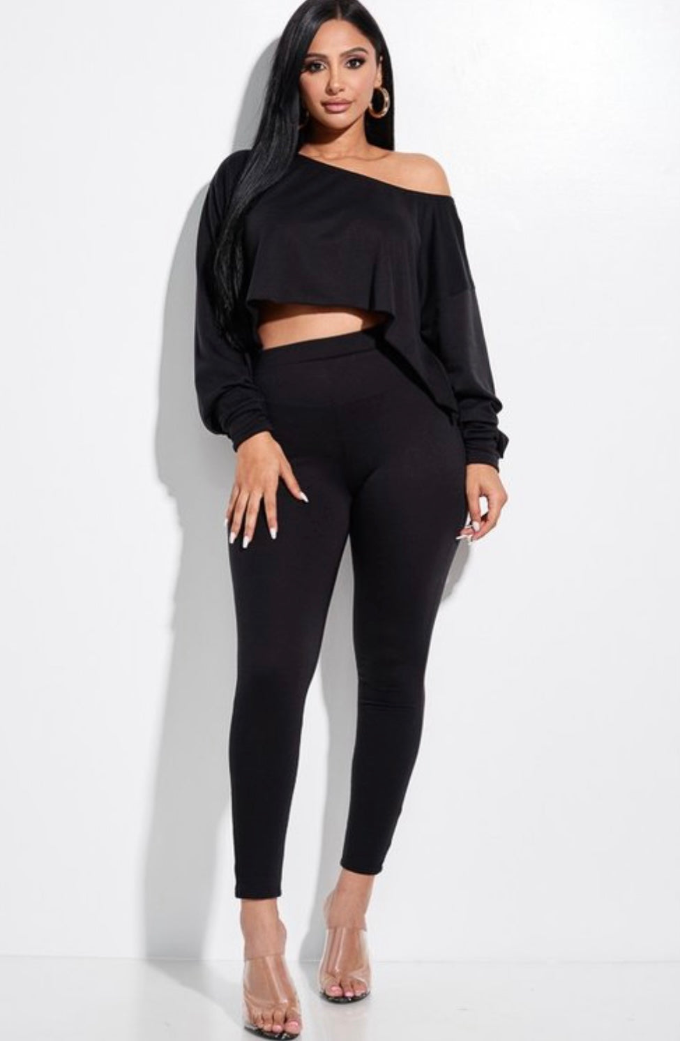 Description: Solid french terry long sleeve slouchy top and leggings two piece set